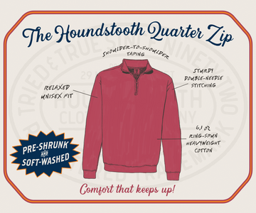 Cut with a relaxed, unisex fit, this quarter-zip offers the reliable feel that’s made Houndstooth a Fayetteville icon for 33 years. Find your perfect size for a lifetime of Arkansas gamedays.