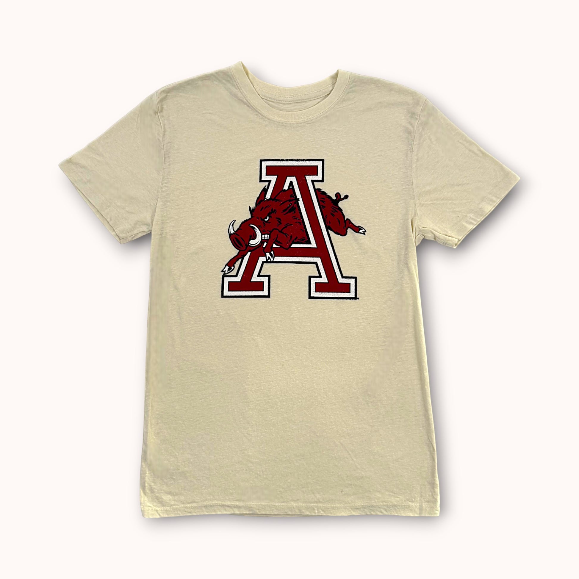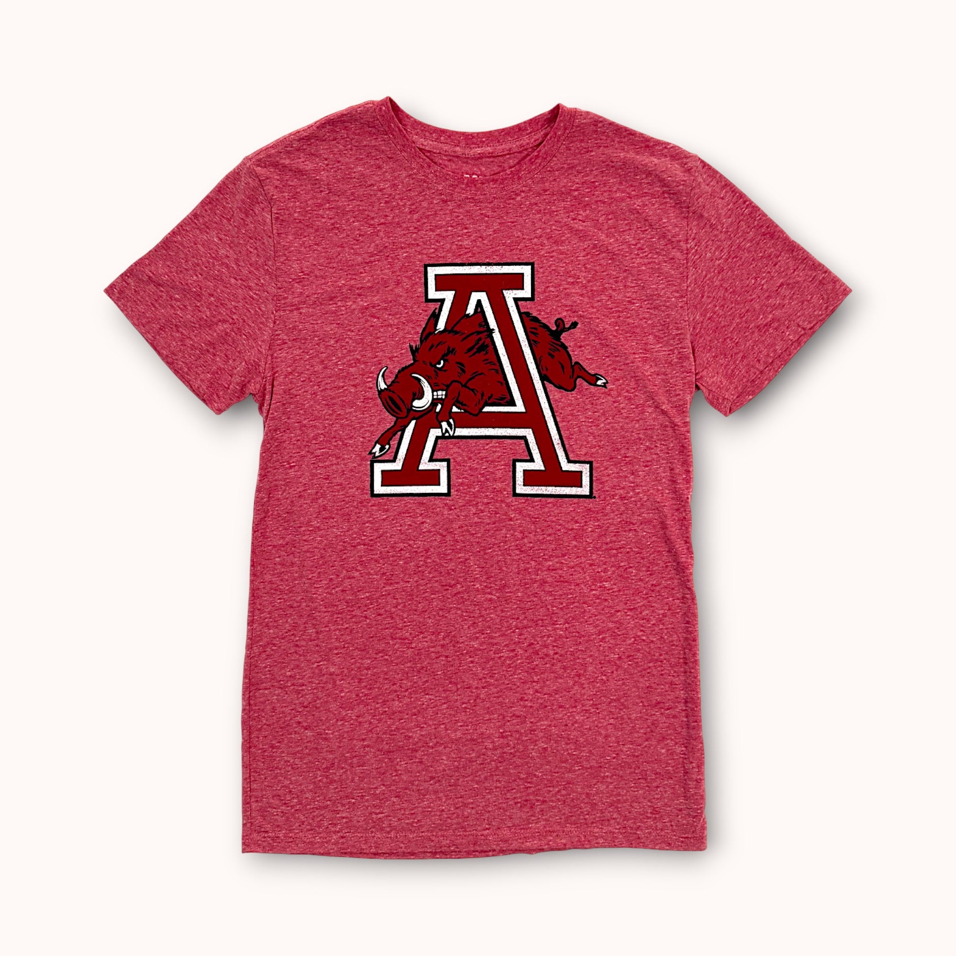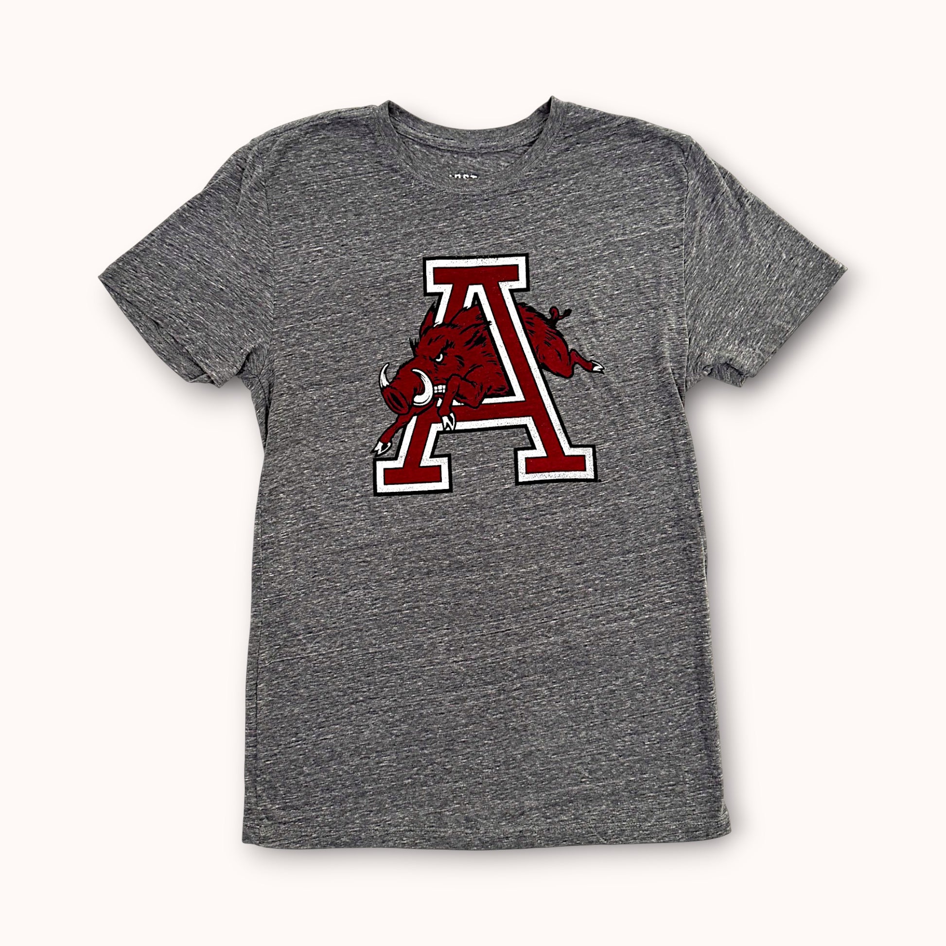 Meet Charger Tri — a nod to Razorback history that feels as timeless as it looks. This vintage Razorback leaping through the A design carries the pride and grit of generations past, printed on a feather-light Tri-Blend tee that moves with you. Soft, breathable, and part of our Black Label Collection, this shirt was made for fans who love their Hogs — and their comfort — in equal measure.