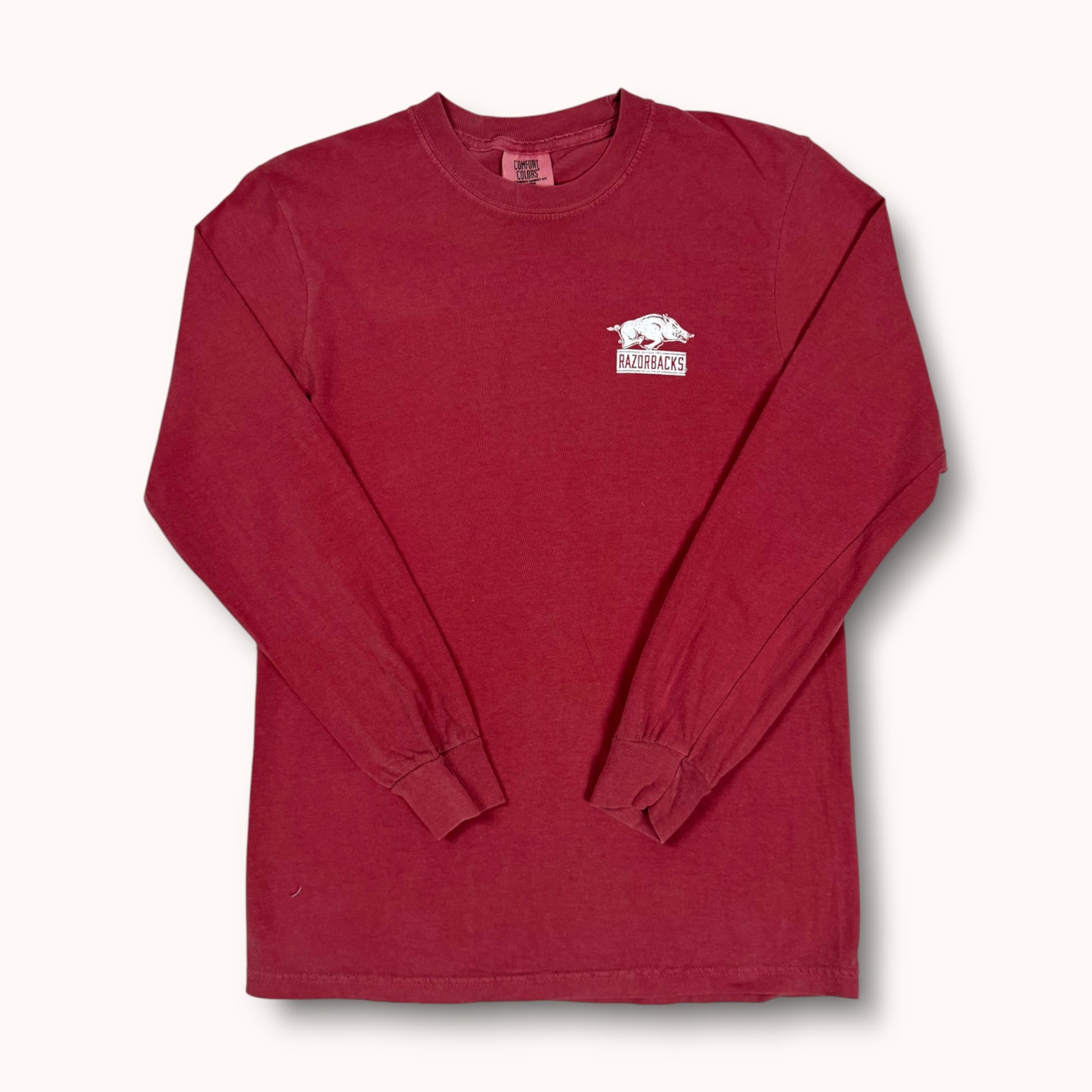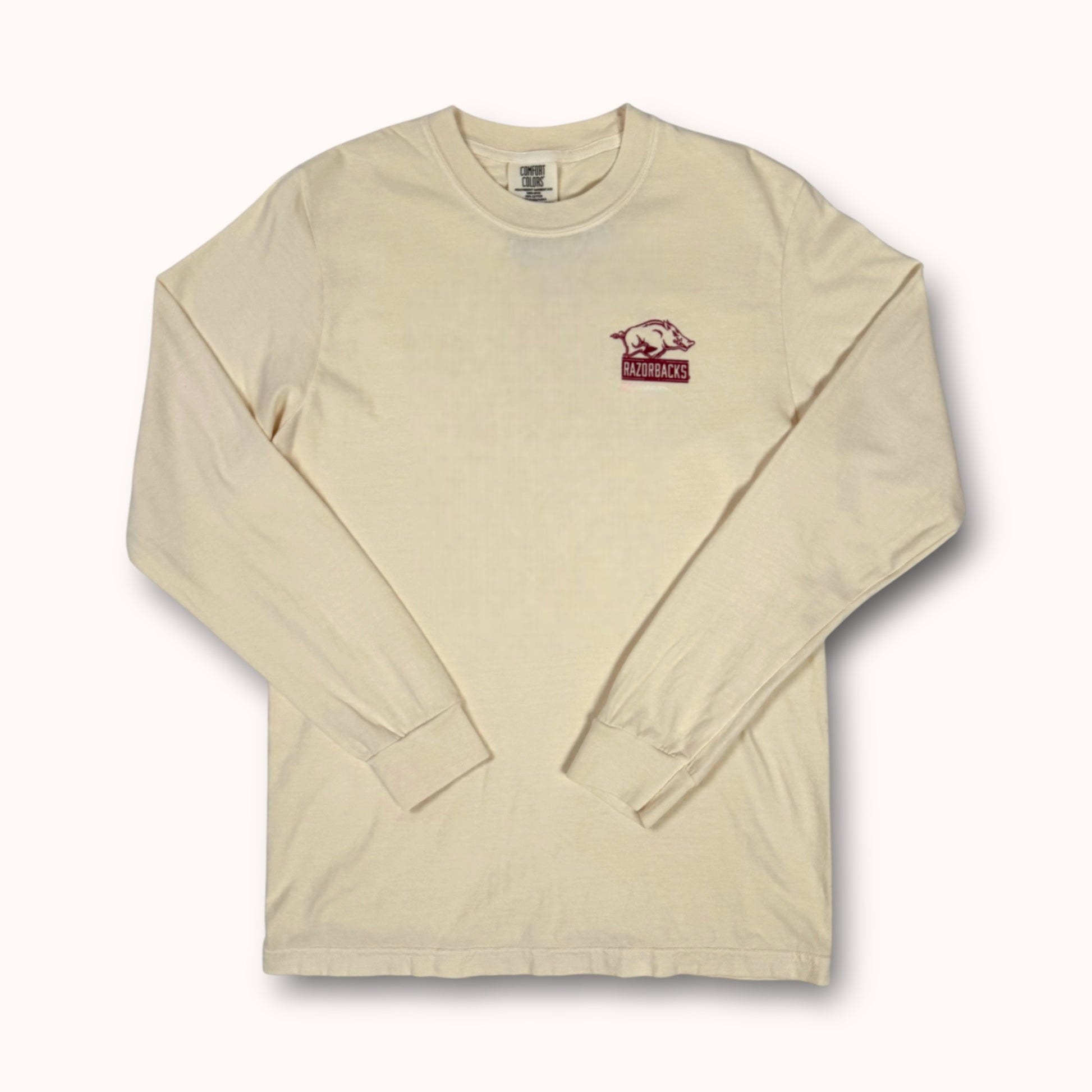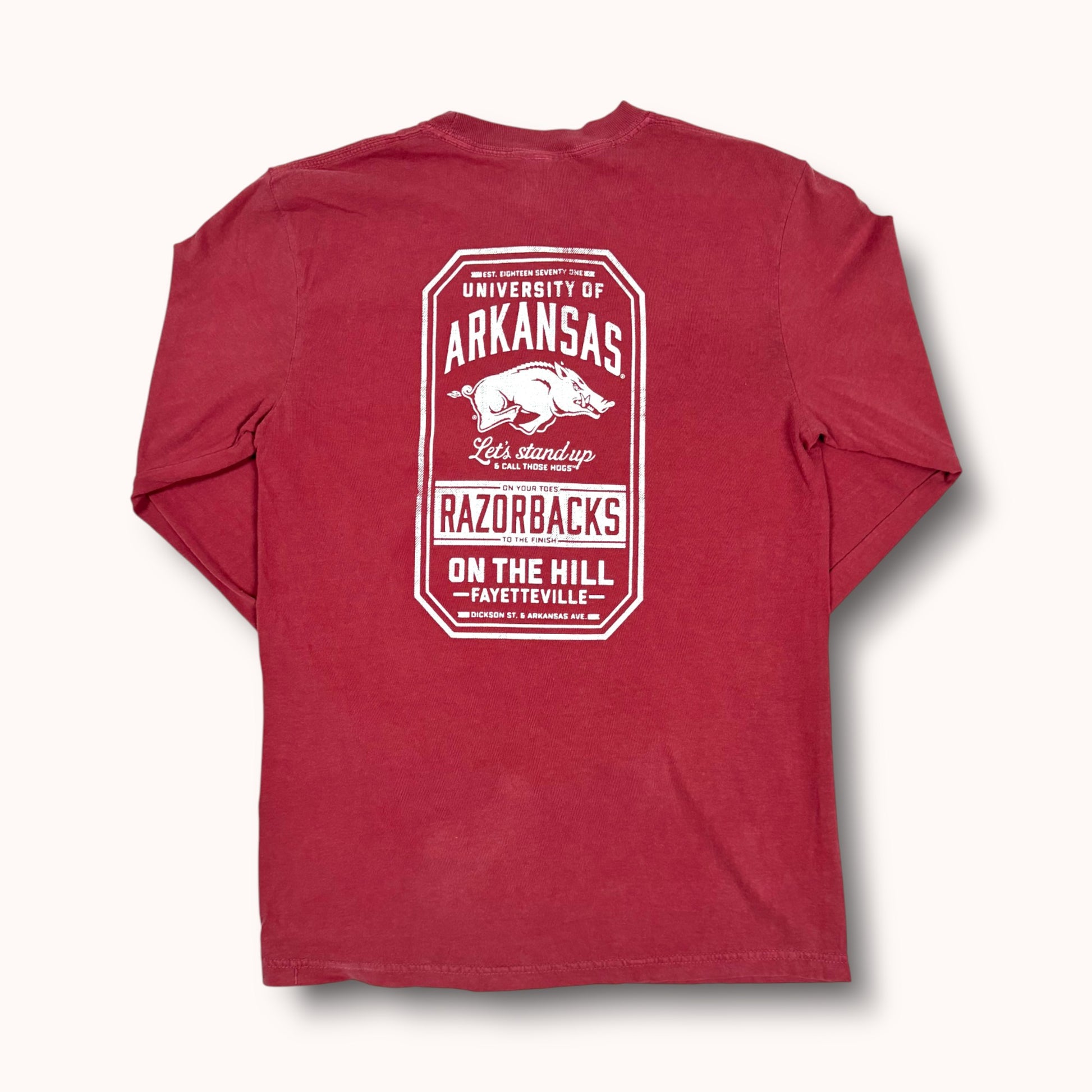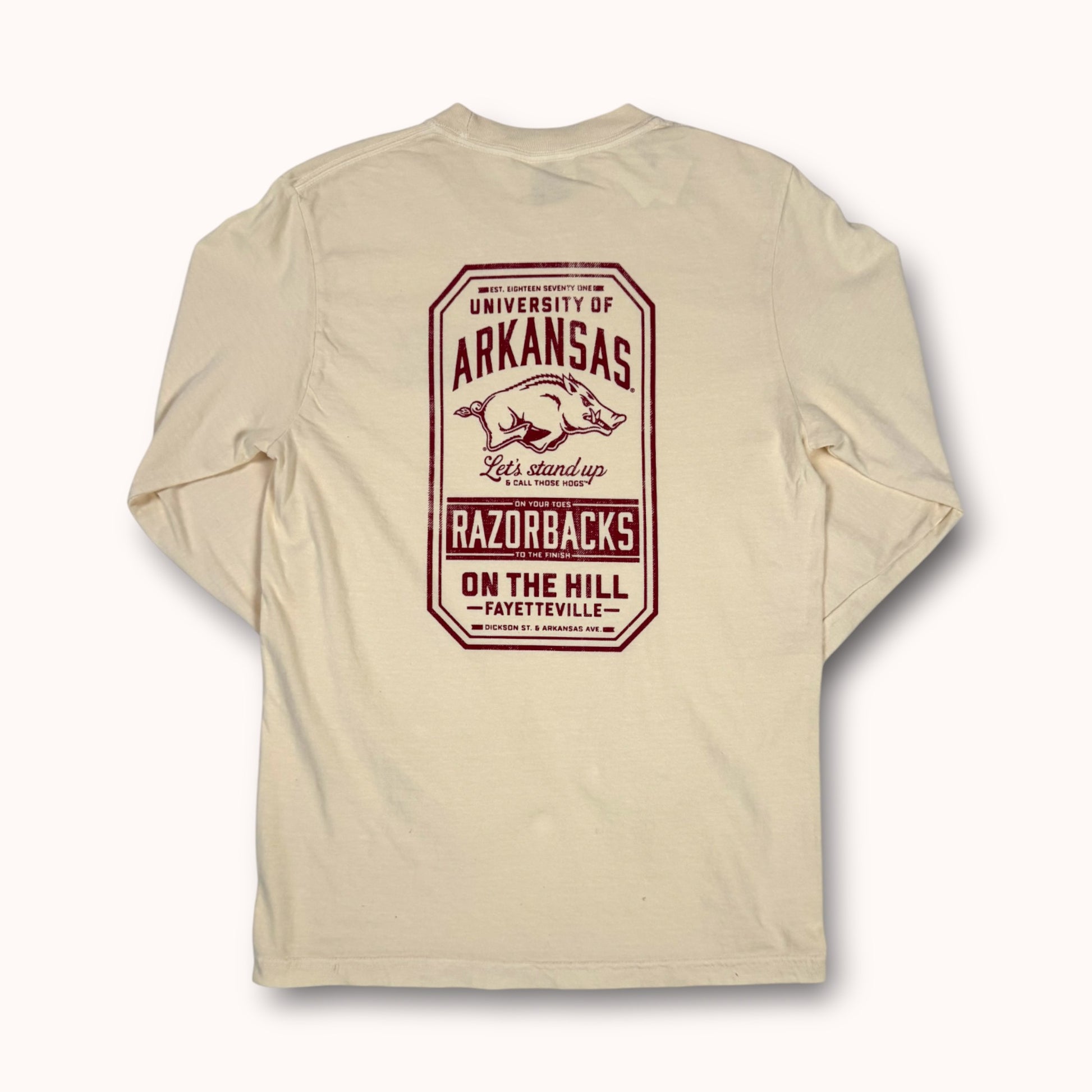 Earlybird awakens the timeless spirit of Razorback pride through a distinctly Houndstooth lens—a classic, unmistakable design with enduring style. At its center, the fierce Tusk logo stands boldly, framed by evocative phrases like “On The Hill” connecting fans worldwide to the heart of Razorback tradition. This design celebrates the dawn of every game day and the promise of new victories, blending heritage, global community, and local passion into one sophisticated statement. Perfect for those who rise early, lead with pride, and carry Razorback spirit with unshakable confidence, Earlybird is a tribute to the timeless legacy and worldwide reach of Arkansas athletics. Famously purchased by Robert Downey Jr. at our Downtown Fayetteville store in the summer of 2024.