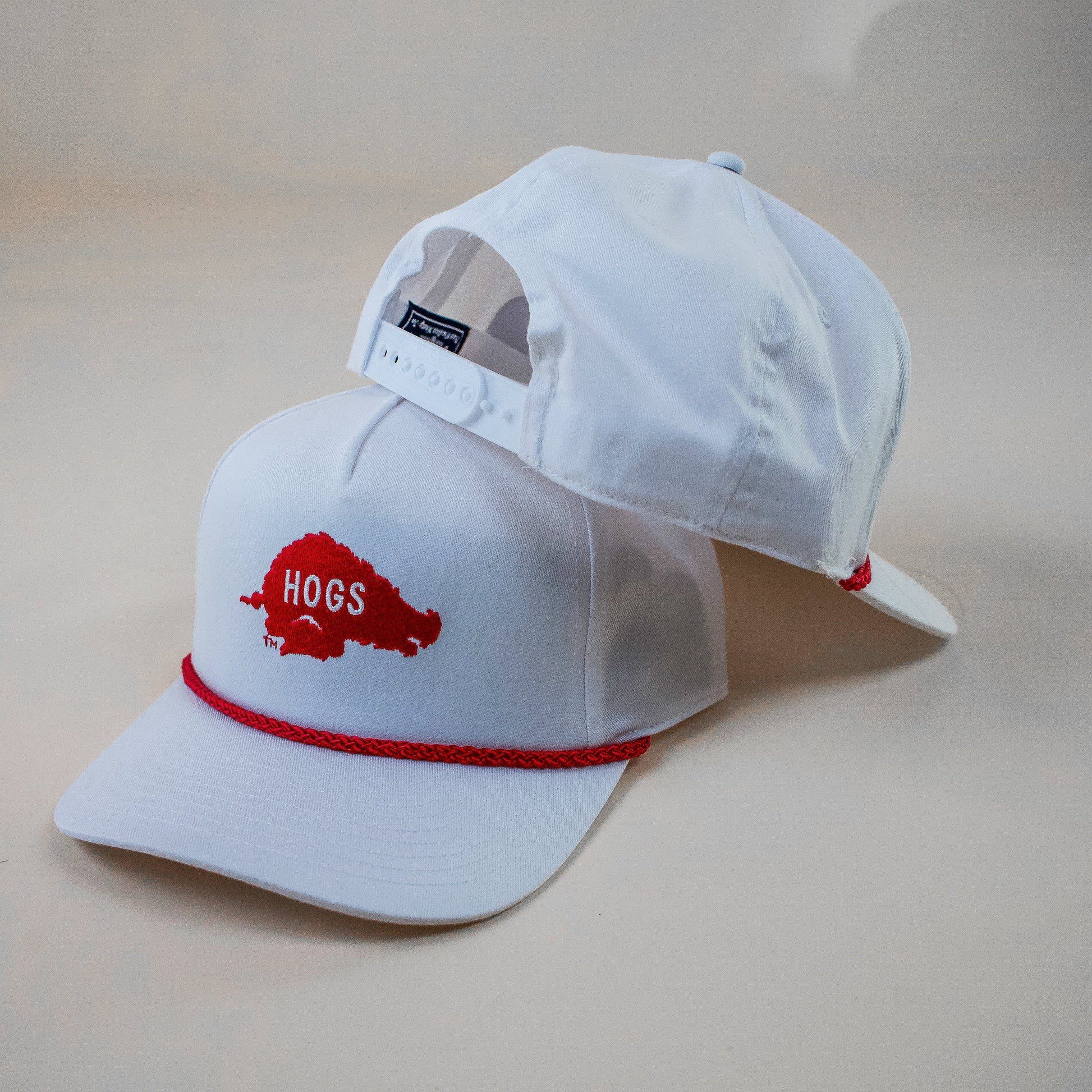 The Hogs 72 Rope Hat keeps it clean, confident, and ready for tip-off, first pitch or kickoff. Crisp white up top with a bold cardinal rope across the brim, it’s a classic silhouette that pulls straight from Arkansas game-day tradition without overdoing it.