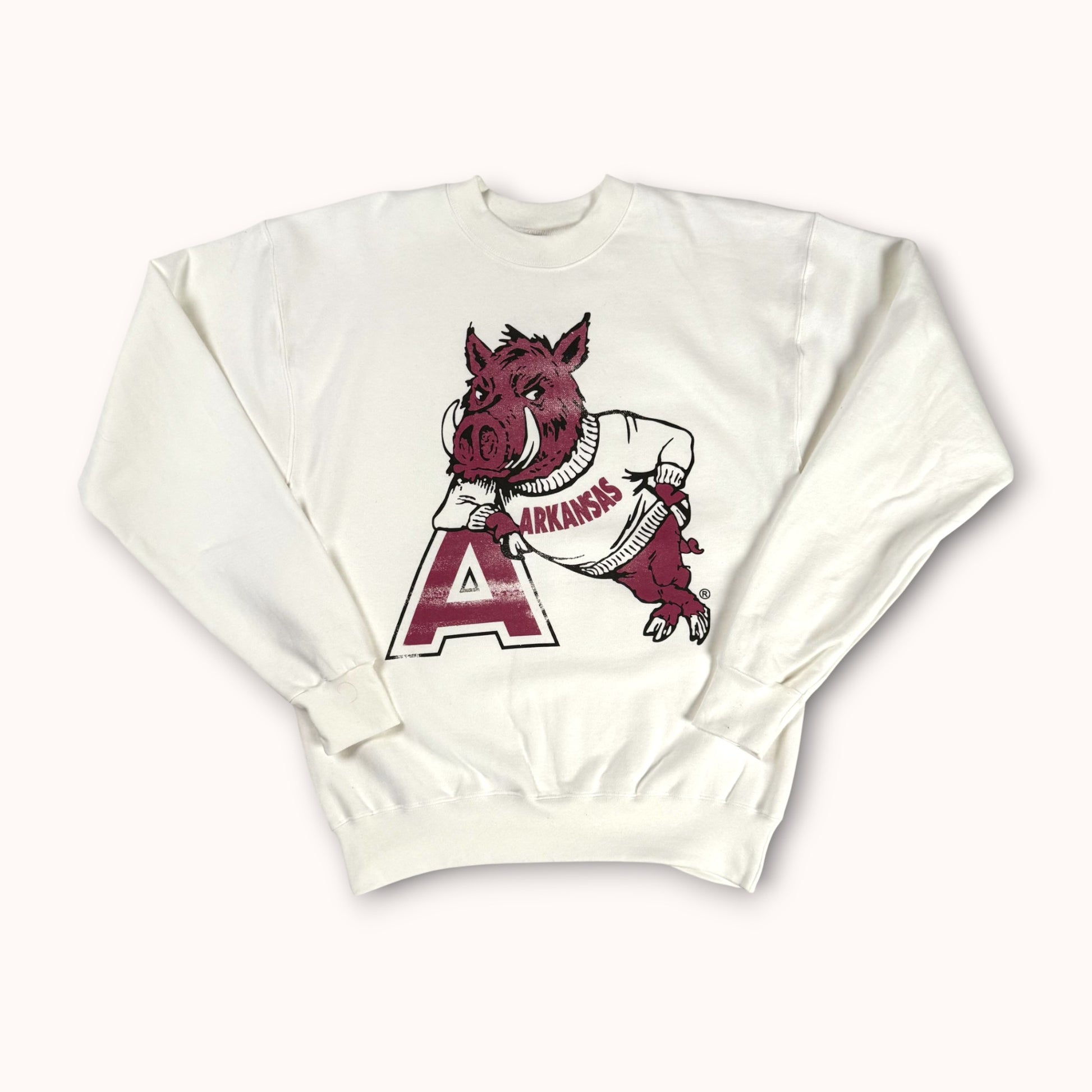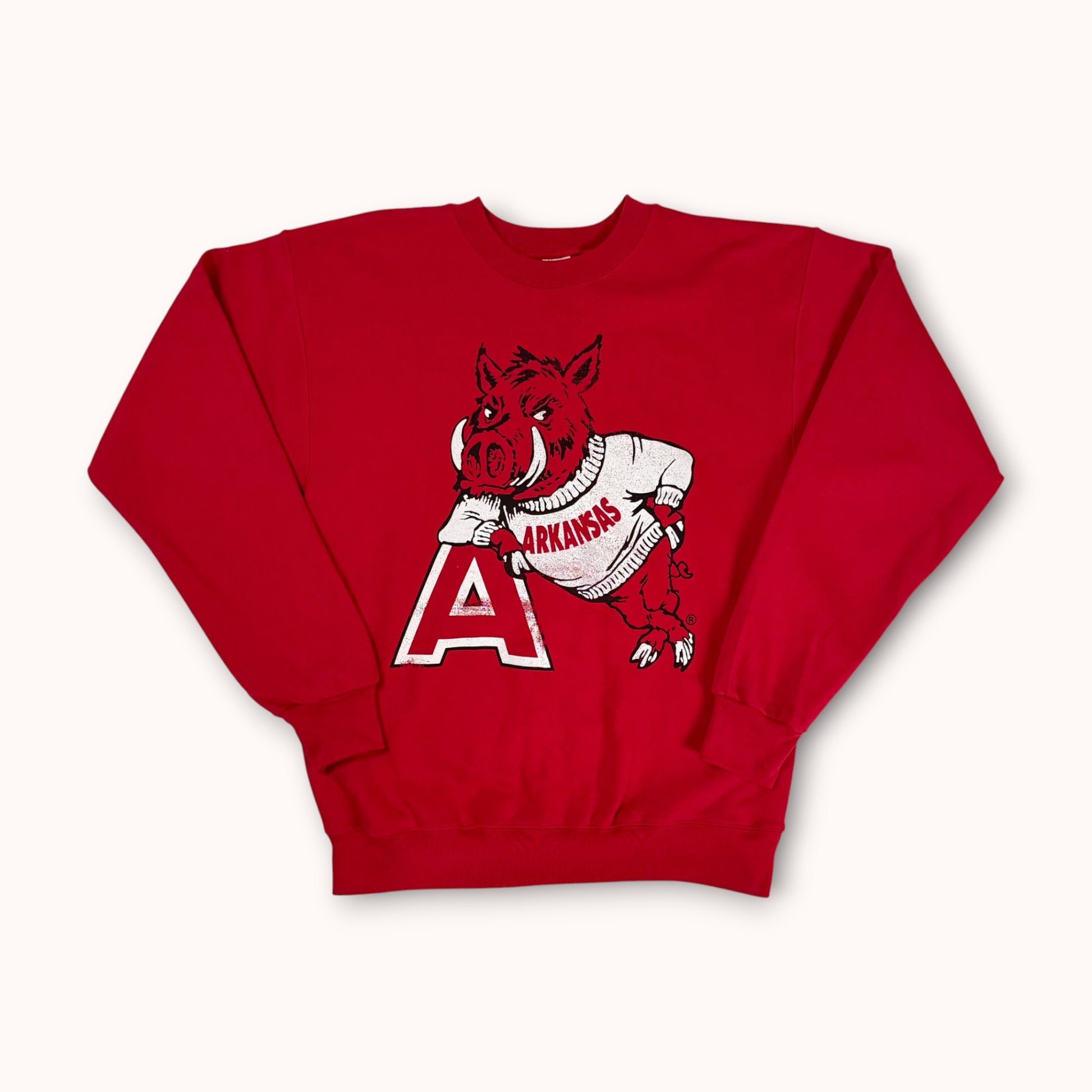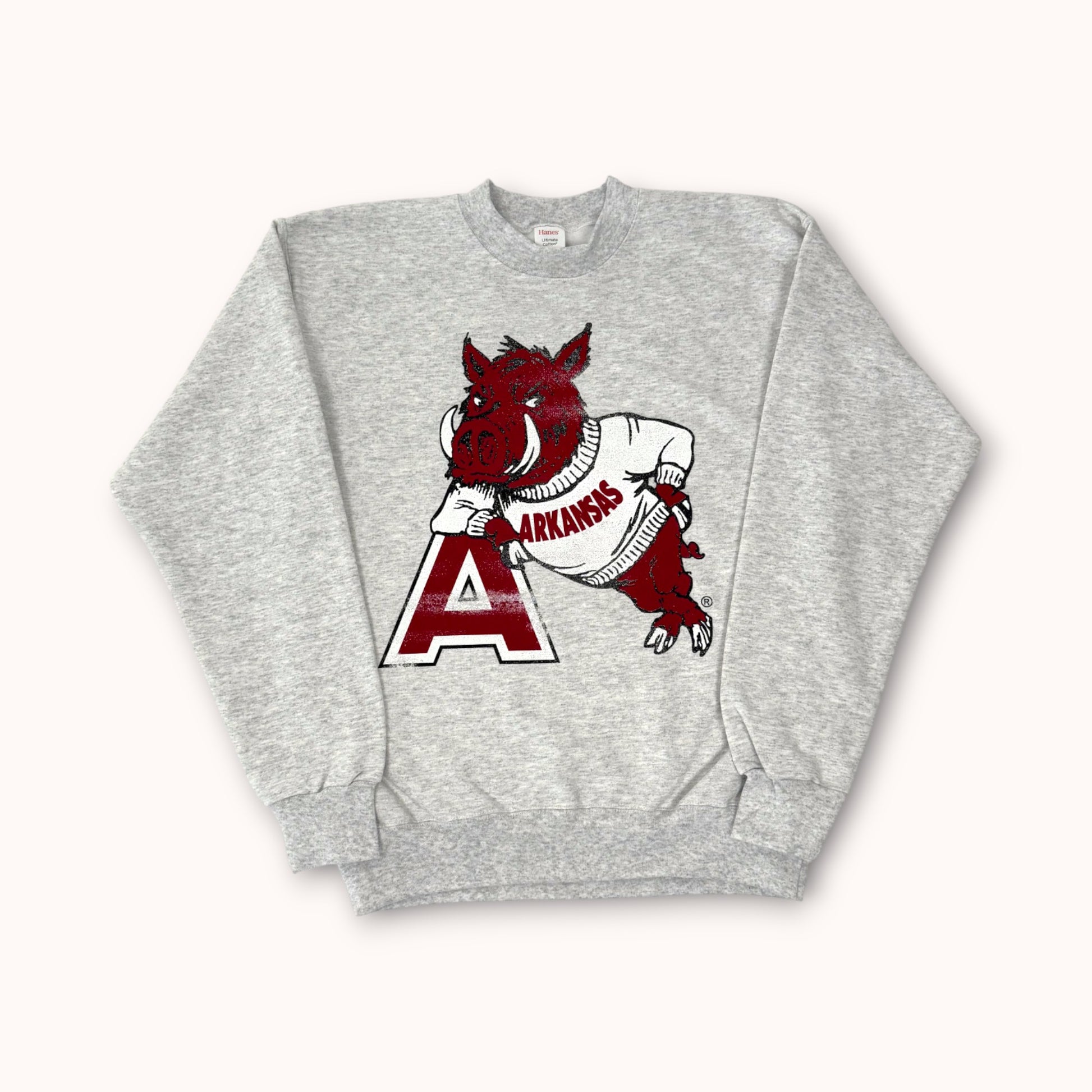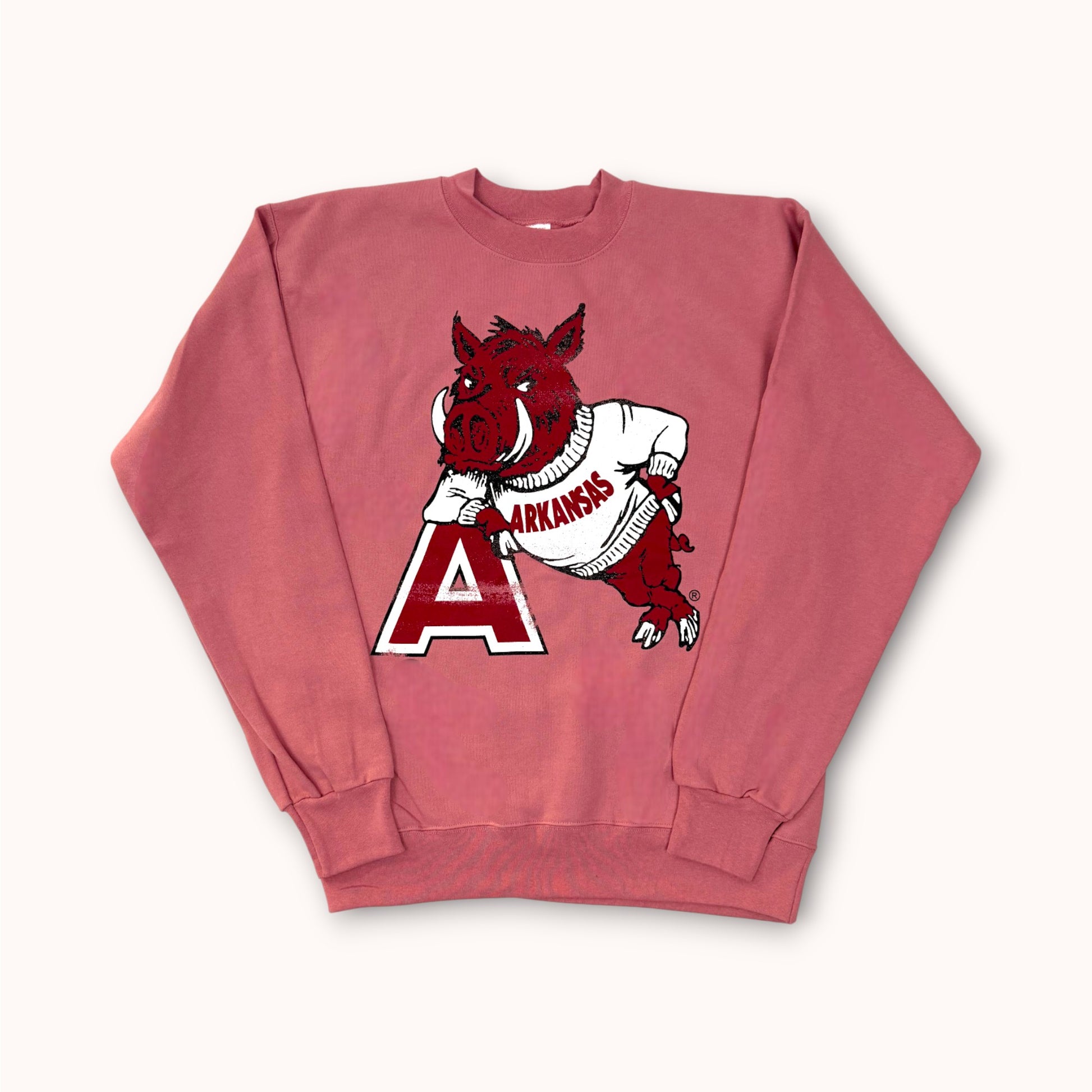 Step into the golden days of campus spirit with the Leaner sweatshirt—a vintage design that instantly transports you back to the buzz of walking into a Houndstooth store on game day during football season. The timeless logo of the collegiate Razorback, proudly clad in a cozy sweatshirt and leaning with swagger on the iconic Arkansas "A," capturing both tradition and playful charm.