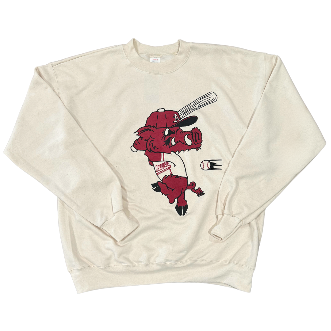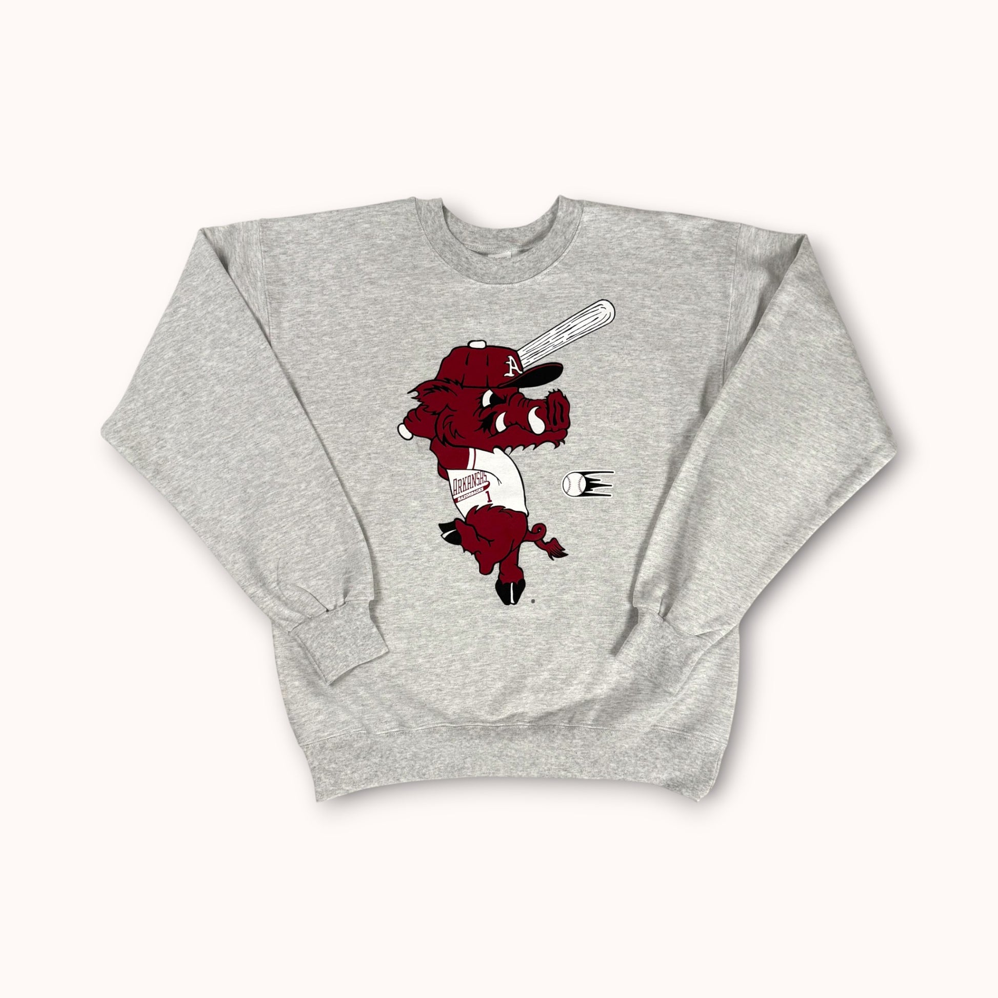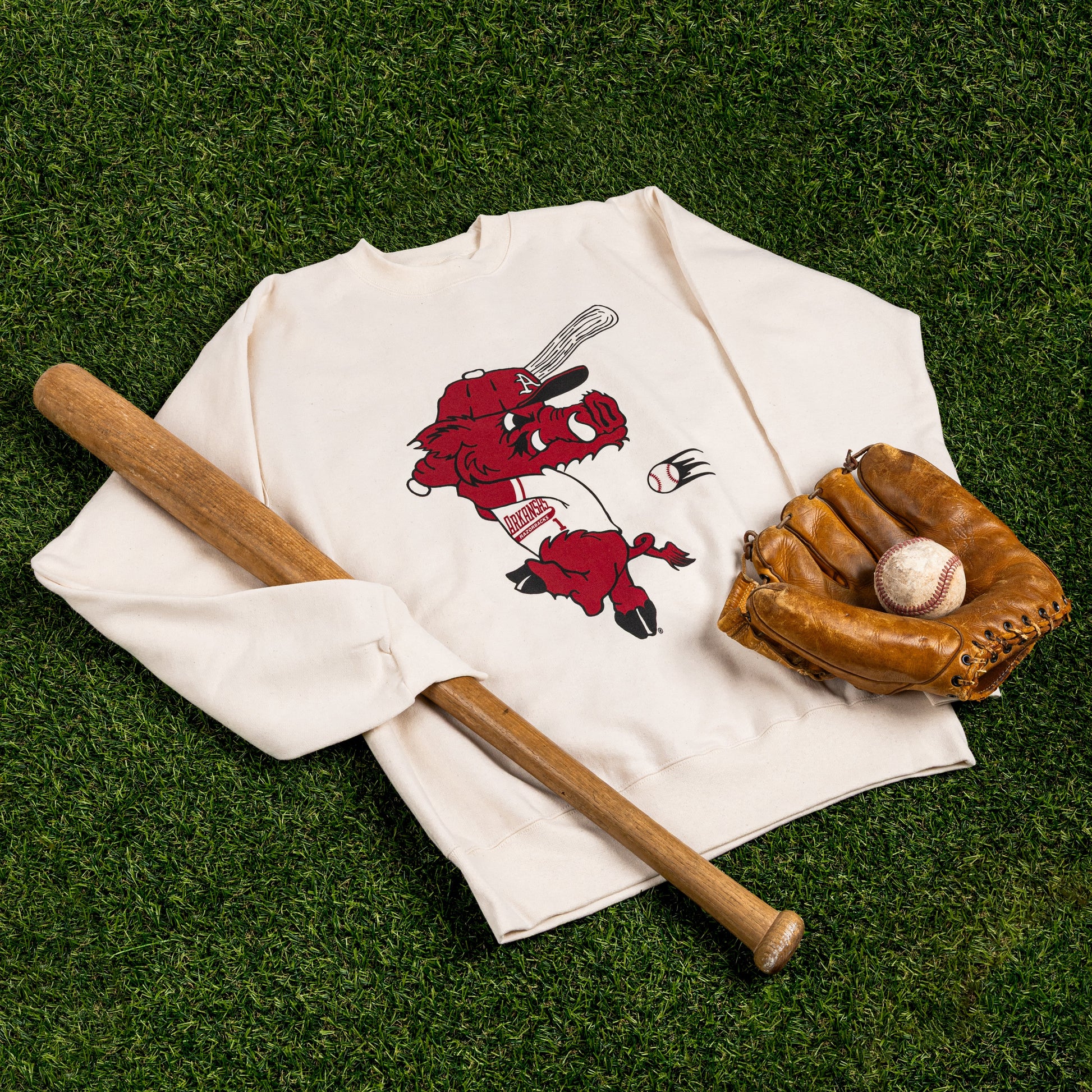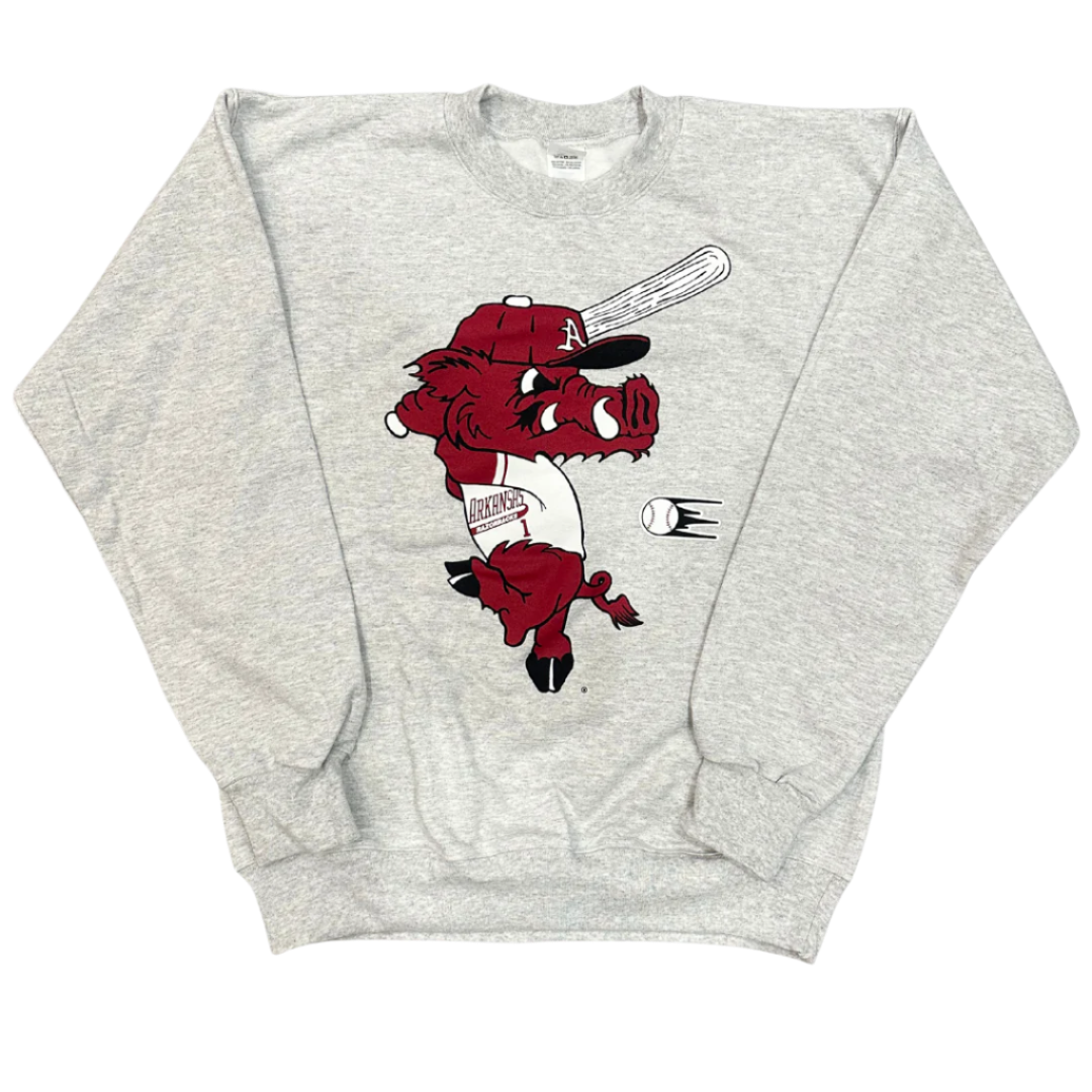 Show off your passion for Arkansas Razorback baseball with our classic Ribby Single long sleeve graphic sweatshirt. The iconic Ribby Razorback, in mid-swing, captures the spirit of Arkansas athletics and the deep-rooted baseball culture. Embrace the quality and comfort that comes with every stitch of Houndstooth apparel and make a statement wherever you go.